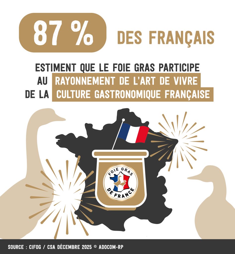 De plus, 87 % (+ 1 pt vs 2024) considèrent que le Foie Gras « participe au rayonnement de l’art de vivre et de la culture gastronomique française dans le monde ».