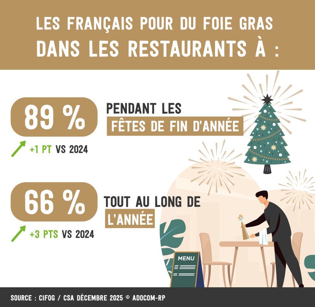 Le Foie Gras fait partie des incontournables des tables des restaurants. Près de 6 Français sur 10 (59 %) disent en consommer lorsqu’ils y vont. 89 % des Français estiment même que le Foie Gras doit être proposé dans les restaurants en fin d’année (+1 pt vs 2024) et les 2/3 (66 %) l’attendent tout au long de l’année (+3 pts).