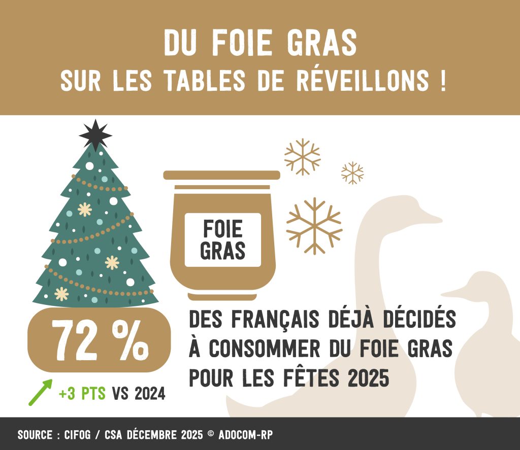 En ces temps incertains, une chose est absolument sûre : il y aura bien du Foie Gras sur les tables de fêtes et ce sont les Français eux-mêmes qui le confirment ! Fin novembre, ils étaient déjà 72 %, soit plus de 7 sur 10, à avoir pris leur décision d’en consommer pour les fêtes de fin d’année 2025 (Source : Enquête CIFOG / Institut CSA menée du 25 novembre au 2 décembre 2025 auprès d’un échantillon de 1 011 Français âgés de 18 ans et plus.). Une proportion en hausse de +3 pts par rapport à l’an passé.