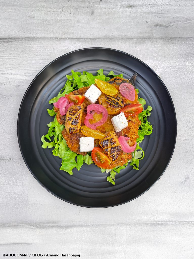 Couper les escalopes poêlées en petits morceaux et les disposer sur les aubergines panées avec de la feta, des tomates cerises et quelques pickles d’oignons rouges.