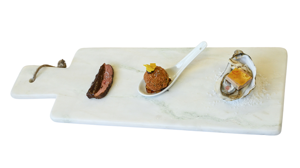 Façonner un lit de gros sel sur chaque planche de service. Y caler une huître. Ajouter un peu de vinaigre de cidre et quelques billes de citron caviar. Placer dessus un carré de Foie Gras puis de la gelée d’huître au safran.
