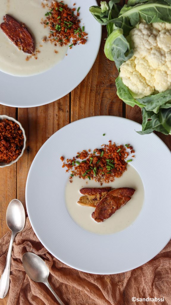 Verser la crème de chou-fleur dans des assiettes creuses, déposer délicatement une tranche de Foie Gras poêlé et saupoudrer de crumble de pain d’épices.
