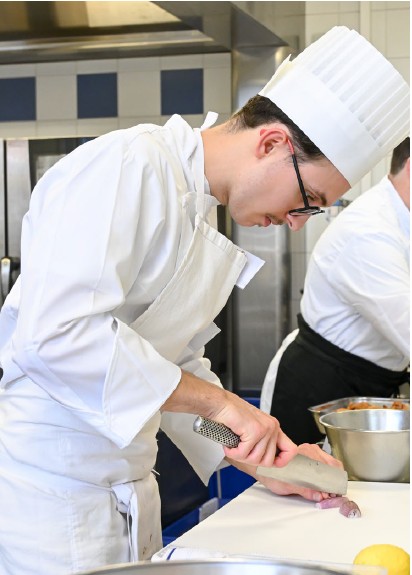 À seulement 21 ans, Maxence Carreau officie donc dans les cuisines d’un Chef de renom, Olivier Nasti, 2 étoiles Michelin pour son restaurant gastronomique le Chambard. À Kaysersberg, le jeune homme est responsable des garnitures au sein de La Winstub du Chambard, où le Chef Nasti réinterprète le terroir alsacien : tarte à l’oignon, presskopf, baeckeoffe, … Maxence est ravi de gagner en expérience à ses côtés et envisage de poursuivre ses découvertes gastronomiques dans d’autres terroirs de France. Ce qu’il aimerait : effectuer un Tour de France culinaire, à l’image des Compagnons. Une fois cette exploration effectuée, il projette de partir à l’international pour découvrir de nouvelles cultures gastronomiques et de nouvelles façons d’assaisonner.