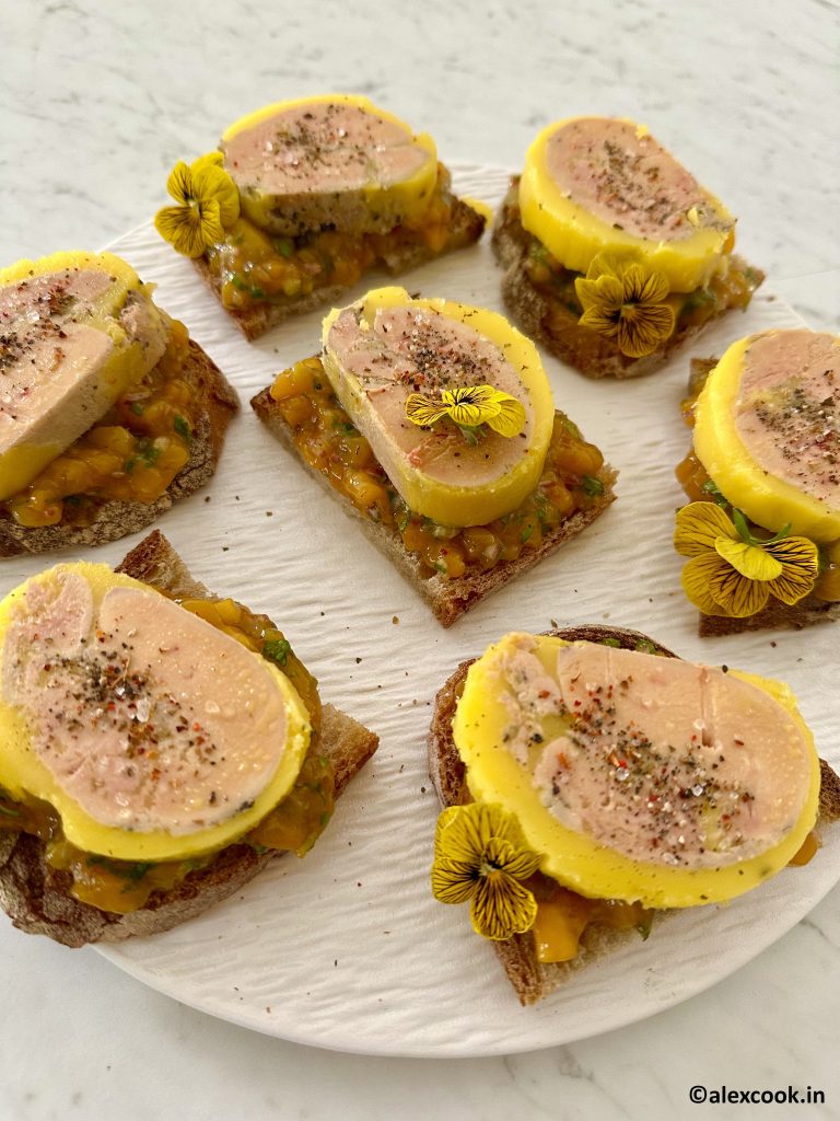 Déposer le chutney de mangue généreusement sur des petits toasts et y ajouter des tranches de Foie Gras d’environ un demi centimètre.